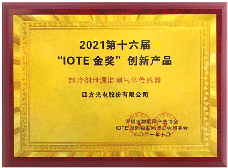 2021年10月,由中國(guó)物聯(lián)網(wǎng)產(chǎn)業(yè)應(yīng)用聯(lián)盟、深圳市物聯(lián)網(wǎng)產(chǎn)業(yè)協(xié)會(huì)主辦的IOTE2021第十六屆深圳國(guó)際物聯(lián)網(wǎng)博覽會(huì)上,四方光電自主研發(fā)的制冷劑泄漏監(jiān)測(cè)氣體傳感器從上萬(wàn)件產(chǎn)品中脫穎而出,被評(píng)為IOTE2021金獎(jiǎng)創(chuàng)新產(chǎn)品。