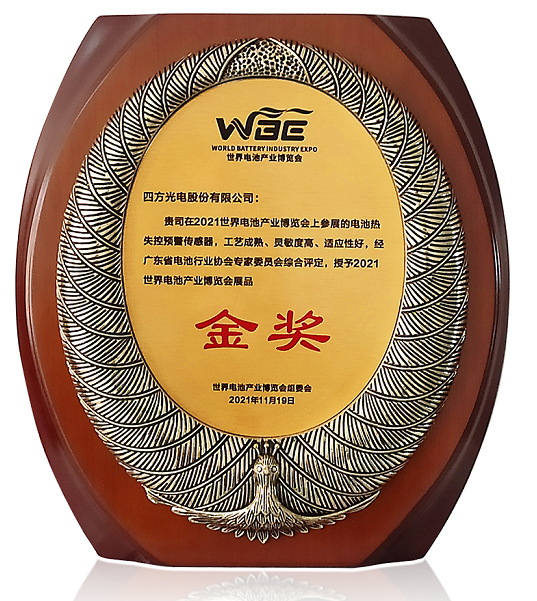 2021年11月,WBE2021世界電池產(chǎn)業(yè)博覽會(huì)暨第六屆亞太電池展在廣州廣交會(huì)展館C區(qū)隆重開(kāi)幕。同期舉辦了2021世界電池之夜暨2021世界電池產(chǎn)業(yè)博覽會(huì)展品金獎(jiǎng)?lì)C獎(jiǎng)典禮,四方光電自主研發(fā)的電池?zé)崾Э仡A(yù)警傳感器榮獲金獎(jiǎng)。