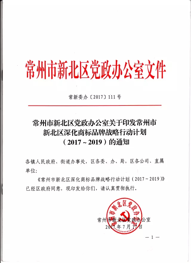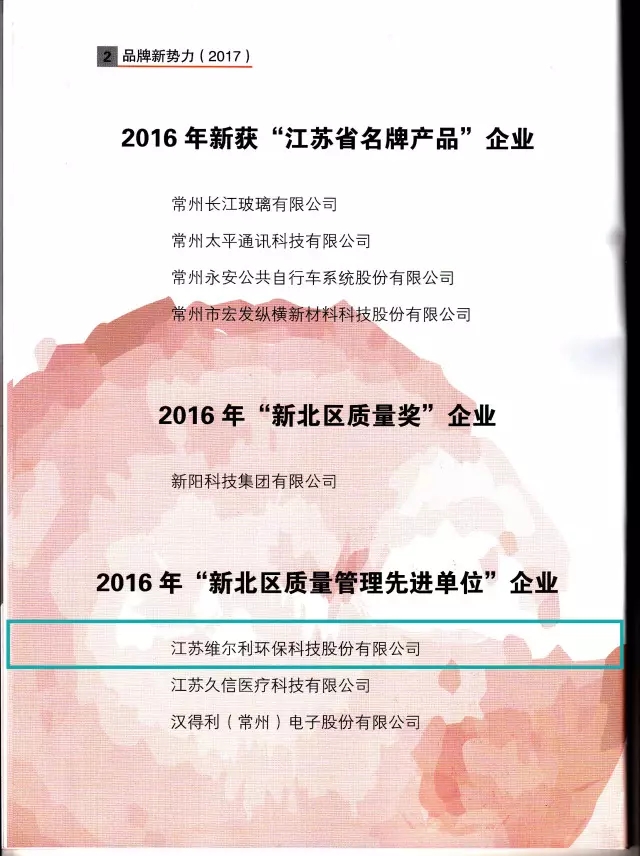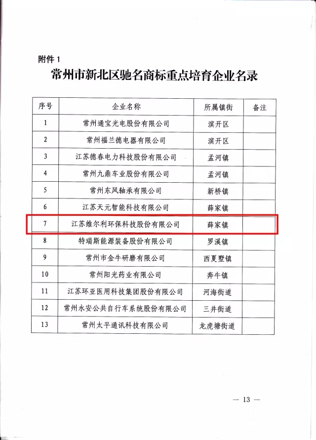 在《常州市新北區(qū)黨政辦公室關(guān)于印發(fā)常州市新北區(qū)深化商標(biāo)品牌戰(zhàn)略行動計(jì)劃(2017-2019)的通知》(常新委辦〔2017〕111號)文件中,提出深化商標(biāo)品牌戰(zhàn)略建設(shè),將維爾利環(huán)保作為常州市新北區(qū)馳名商標(biāo)重點(diǎn)培育企業(yè),實(shí)施“產(chǎn)業(yè)品牌提升”工程,打響產(chǎn)業(yè)品牌特色優(yōu)勢,培育細(xì)分行業(yè)新品牌。