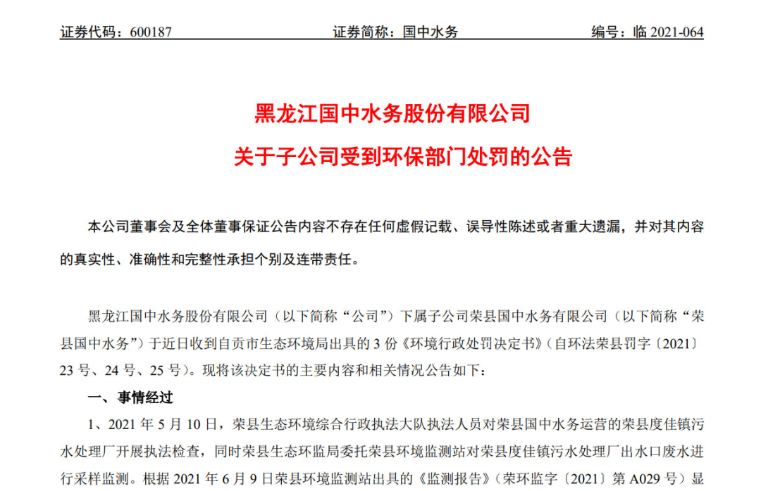 2、黑龍江國中水務股份有限公司關于子公司收到環(huán)保部門處罰決定書的公告。國中水務,2021-08-12