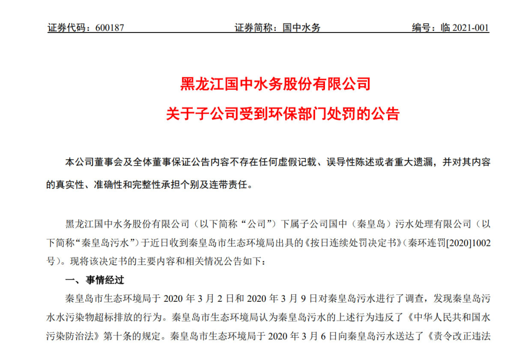 第一次,是1月6日,國中水務公告稱,下屬子公司國中(秦皇島)污水處理有限公司(下稱“秦皇島污水”)收到秦皇島市生態(tài)環(huán)境局出具的《按日連續(xù)處罰決定書》(秦環(huán)連罰[2020]1002號),被罰款414萬元。
