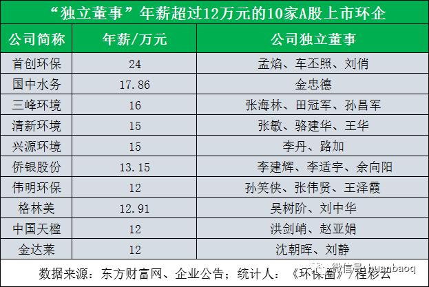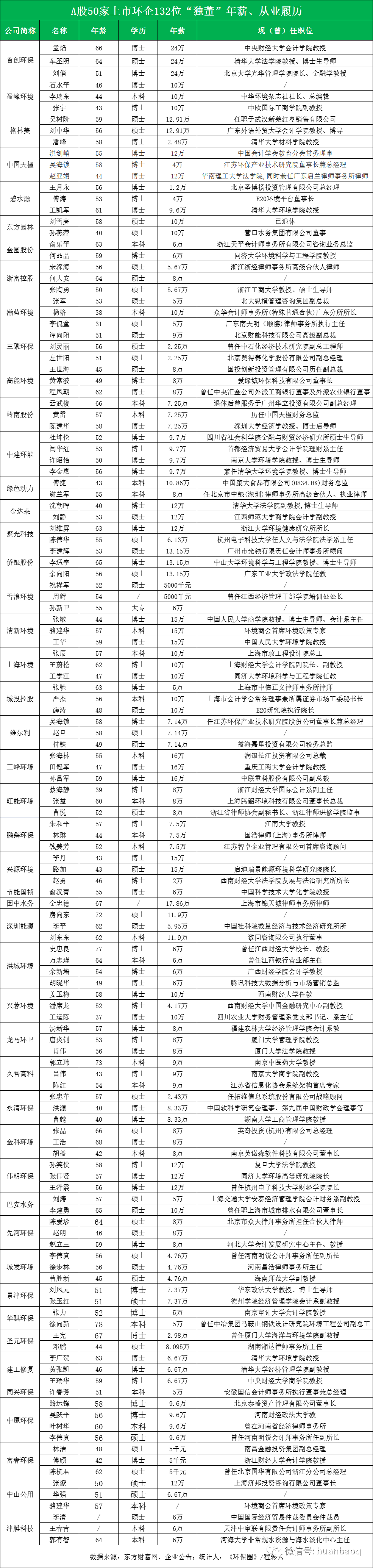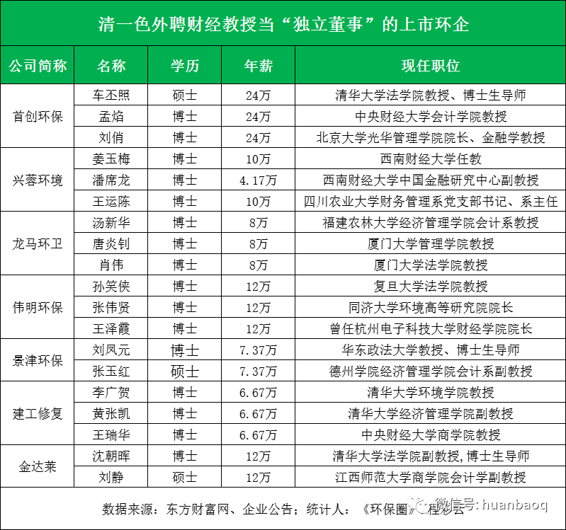 揭秘A股50家上市環(huán)企的132位獨董:簡單了解獨董職責之后,我們回歸環(huán)保行業(yè),談一談A股上市環(huán)企的獨立董事們。筆者查閱資料發(fā)現(xiàn),自從康美案落定后,A股上市環(huán)企中,還真有兩家上市環(huán)企獨董因個人原因提交了辭呈。一位是年薪僅5千元的富春環(huán)保獨立董事林潔,另一位是新三板公司博芳環(huán)保的獨立董事陳麗紅。兩個人都是因為“個人原因”提交的辭呈,巧合的是,辭職的時間都是在康美處罰案落地前后。排除這兩家之外,《環(huán)保圈》發(fā)現(xiàn),A股上市環(huán)企絕大多數(shù)獨立董事都比較淡定,沒有在敏感時期提出辭職。為了讓讀者進一步了解上市環(huán)企獨董的背景,《環(huán)保圈》對A股50家上市環(huán)企中132位獨立董事進行了逐一統(tǒng)計,從而進一步觀察他們年薪、學歷、背景、從業(yè)經(jīng)歷。首先,每家上市環(huán)企外聘的獨立董事數(shù)量幾乎是一樣的,都是3-4個。這跟證監(jiān)會要求有關(guān),“上市公司獨立董事人數(shù)不得少于董事會成員的1/3”。由于環(huán)保上市企業(yè)本身規(guī)模不大,董事會成員大多在10人左右,所以匹配3-4個獨立董事最為合適。其次,從薪資上看,每家企業(yè)外聘獨立董事的工資也是不一樣的。最高的當屬首創(chuàng)環(huán)保,分別給予孟焰、車丕照、劉俏教授年薪24萬/年;其次是國中水務,其獨立董事金忠德薪酬17.86萬元/年;再者還有三峰環(huán)境、清新環(huán)境、興源環(huán)境、偉明環(huán)保、僑銀股份、格林美,中國天楹、金達萊等,這幾家企業(yè)對獨董也非常大方,年薪都在12萬/年以上,平均每月收入1萬元左右。