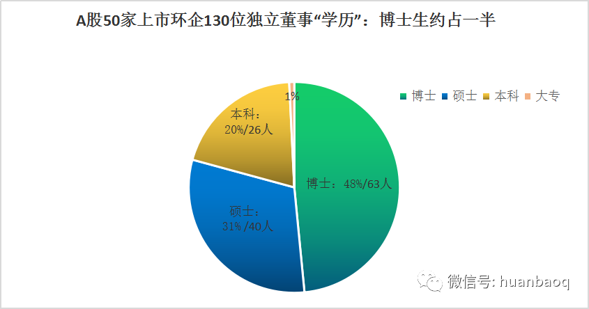 雖然獨董這個職位工資看起來不太高,風險又很大,但它也不是人人都可以當?shù)?,至少?個門檻:首先是學歷門檻,最低是本科,80%以上是碩士、博士。雖然《證券公司董事、監(jiān)事和高級管理人員任職資格監(jiān)管辦法》適當將證券公司獨立董事放寬至大專,但是在實踐中,別說大專學歷,就連本科學歷在獨立董事一職中也沒啥競爭力。筆者統(tǒng)計了A股50家上市環(huán)企130位獨董發(fā)現(xiàn),有且只有一位是大專學歷(雪浪環(huán)境獨董孫新衛(wèi)),但他同時還擁有注冊會計師、注冊評估師、會計師、資產(chǎn)評估師等證書,一定程度上彌補了學歷上的不足。剩余的129個獨立董事,80%以上是碩士、博士,其中博士占據(jù)了半壁江山,甚至有些還是博士生導師。▼A股50家上市環(huán)企132位獨立董事學歷統(tǒng)計