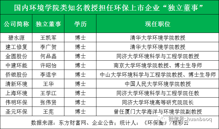 筆者還發(fā)現(xiàn)一個現(xiàn)象,有些環(huán)境院校的知名教授也兼職了獨立董事一職,不少還是業(yè)內(nèi)熟悉的面孔。比如業(yè)內(nèi)大咖王凱軍老師,既是碧水源的獨立董事,也是北控水務的獨立董事;再如同濟大學的何品晶老師,也是身兼數(shù)職,同時擔任金圓股份獨立董事、寶武集團環(huán)境資源科技董事、天津建昌環(huán)保董事等,還有中山大學教授李適宇也擔任著僑銀股份的獨立董事。▼擔任上市環(huán)企獨立董事一職的環(huán)境學院類教授