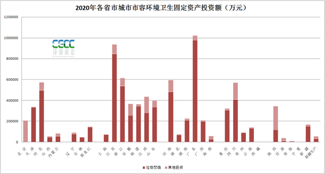 從區(qū)域來看,2020年,廣東(97.3億元)、江蘇(84.6億元)、浙江(53.7億元)以及河北(49.7億元)、河南(48.3億元)等地環(huán)境市容衛(wèi)生設(shè)施建設(shè)投入較大,其中大部分資金用于垃圾處理設(shè)施建設(shè)。整個(gè)“十三五”時(shí)期,北京、廣東、江蘇等地城市環(huán)境衛(wèi)生固定資產(chǎn)投資較大,其中北京五年的投資額接近400億,特別是2016年、2017年兩年,投資額均在百億以上。
