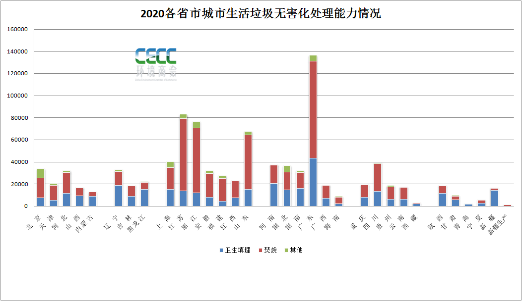 從無害化處理量上來看,截至2020年,在兩億多噸無害化處理總量中,垃圾焚燒處理生活垃圾14607.64萬噸,占處理總量的62%,衛(wèi)生填埋處理生活垃圾7771.54萬噸,占比約33%。其他無害處理方式處理生活垃圾1073萬噸,占比約4.6%。縱觀“十三五”這五年的數(shù)據(jù),衛(wèi)生填埋和垃圾焚燒這兩種生活垃圾處理的主要方式出現(xiàn)主次地位交替現(xiàn)象。分水嶺在2018年。2018年左右,填埋處理能力趨向頂峰,之后基本持平,略有降低,而城市垃圾焚燒處理能力“十三五”出現(xiàn)大幅提升,平均增速在21%。填埋和焚燒2018年經(jīng)歷持平之后垃圾焚燒能力超過填埋。如果從無害化處理量上來看,填埋處理總量在近兩年出現(xiàn)比較明顯的減少,2019年到2020年減少幅度在3175萬噸左右。截至2020年,廣東、山東、江蘇、浙江四個省無害處理設施建設數(shù)量領跑,分別為118座、97座、85座和76座,它們建設的垃圾焚燒處理設施也最多,分別擁有57座、49座、46座、43座。而衛(wèi)生填埋場相對較多的省市則是廣東?。?8座)、河北省(38座),河南?。?6座),湖北?。?4座)。按區(qū)域來看,華北地區(qū)、華中地區(qū)以及西南地區(qū)、東北地區(qū)建設垃圾填埋場數(shù)量明顯多于華東、華南地區(qū)。如果從無害化處理能力來看,又是另一番景象。廣東、山東、江蘇、浙江四省無害化處理能力仍然領跑,其中垃圾焚燒處理能力分別達到87416噸/日、49450噸/日、65420噸/日、58630噸/日。可以看到排序略有變化,江蘇、浙江的垃圾焚燒處理能力高于山東省,推算如果論平均單體垃圾焚燒項目規(guī)模,江蘇和浙江省高于山東省。數(shù)據(jù)中還可以看到,這幾個省份是大力發(fā)展生活垃圾焚燒的省份,不僅焚燒廠建得多,而且垃圾焚燒日處理能力和處理量也處在突出高位。再看其他區(qū)域,實際上從日處理能力上來看,湖北、河北、四川等省市雖然垃圾焚燒廠不及垃圾填埋場多,但日處理能力比填埋高,仍是以垃圾焚燒處理為主,也可以看出這幾個地方單體垃圾焚燒處理廠的規(guī)模相對較大,而陜西、河南以及地廣人稀的東北地區(qū)等地仍以填埋為主要方式。