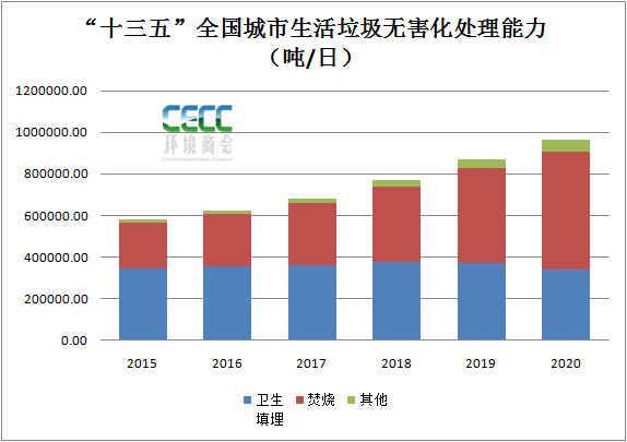 1. “十三五”全國城市環(huán)境衛(wèi)生水平截至2020年,我國城市生活垃圾清運量達到23512萬噸,較“十二五”末新增22.7%,生活垃圾處理量23492.68萬噸,較“十二五”新增25.3%,其中無害化處理量23452.33萬噸,城市生活垃圾無害化處理率超99.8%,較“十二五”增長30.19%。無害化處理能力達到963460噸/日,其中衛(wèi)生填埋能力達到337848.11噸/日,垃圾焚燒處理能力達到567804.44噸/日。