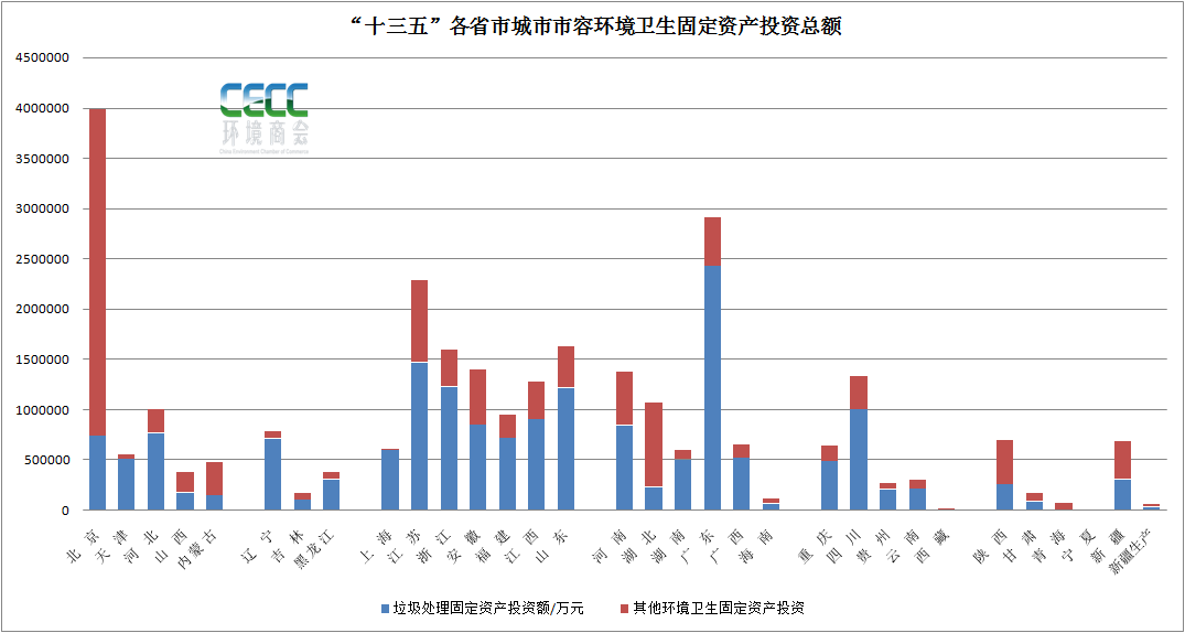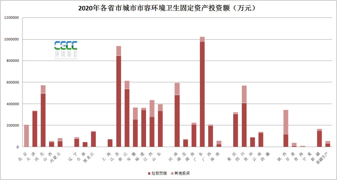 從區(qū)域來看,2020年,廣東(97.3億元)、江蘇(84.6億元)、浙江(53.7億元)以及河北(49.7億元)、河南(48.3億元)等地環(huán)境市容衛(wèi)生設施建設投入較大,其中大部分資金用于垃圾處理設施建設。整個“十三五”時期,北京、廣東、江蘇等地城市環(huán)境衛(wèi)生固定資產(chǎn)投資較大,其中北京五年的投資額接近400億,特別是2016年、2017年兩年,投資額均在百億以上。