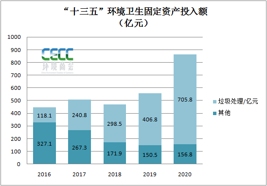 4. “十三五”城市環(huán)境衛(wèi)生固定資產(chǎn)投資情況“十三五”時期,城市市容環(huán)境衛(wèi)生累計固定資產(chǎn)投資總額2844億元,其中垃圾處理累計投資1770億元,較“十二五”整體增長145%。2020年,市容環(huán)境衛(wèi)生方面的固定資產(chǎn)投資額為862.648億元,占全年固定資產(chǎn)總投資的3.9%,其中垃圾處理設施建設投入資金逐年提升,從2016年118億左右增至2020年705.8億元,投資額占環(huán)境衛(wèi)生固定資產(chǎn)投資總額的比例較“十二五”提升42.2%。