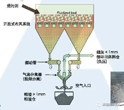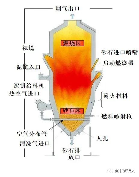 污泥進爐口位于砂床上方,流化床干化到干度90%左右,爐子需要干濕污泥一起燒,因此需要搭配。半干污泥輸送采用螺旋和刮板輸送的方式送入焚燒爐內(nèi)。(小編說:進料采用砂床上方進料,污泥進入后會往下掉,上部需要做的更大,才能保證煙氣停留時間。)