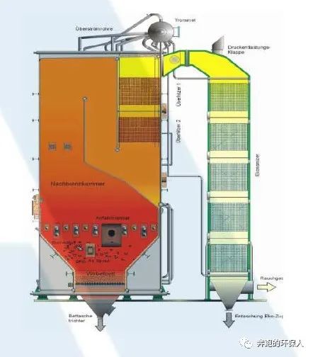 煙氣處理系統(tǒng)爐內(nèi)SNCR脫硝、靜電除塵器、布袋除塵器、濕式洗滌塔、再熱器(煙煙換熱)、煙囪排放(高度50m)