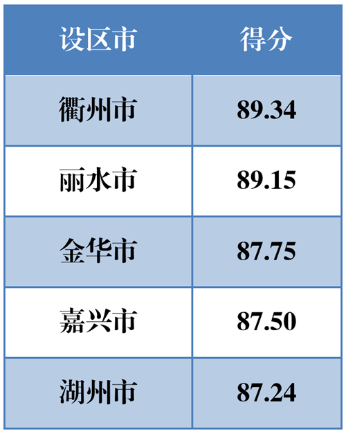 設(shè)區(qū)市比學(xué)趕超、保先爭先,呈現(xiàn)齊頭并進(jìn)態(tài)勢,地區(qū)差異不斷縮小??偟梅峙琶叭坏姆謩e是衢州市、麗水市和金華市,區(qū)域之間最高與最低相差6.42,較去年收窄0.49。