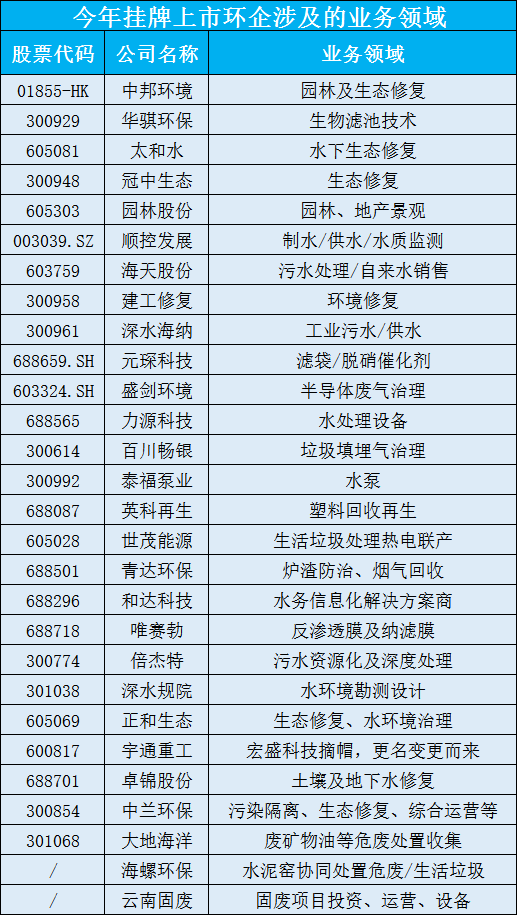而如今上市的環(huán)保企業(yè),無論是主板,還是創(chuàng)業(yè)板、科創(chuàng)板,都有一個(gè)共性,就是大都是給早期工程項(xiàng)目做配套、做服務(wù)、做運(yùn)營(yíng)的企業(yè),這些企業(yè)伴隨著“前輩們”成長(zhǎng),他們自身也在壯大。所以我們看到近兩年上市的企業(yè),既是環(huán)保行業(yè)非常細(xì)分的子領(lǐng)域,也是產(chǎn)業(yè)下游設(shè)備技術(shù)廠商,做膜、水泵、生物濾池、勘測(cè)設(shè)計(jì)、水質(zhì)監(jiān)測(cè)、垃圾滲濾液、填埋氣治理的都紛紛登錄資本市場(chǎng)(如下圖)。