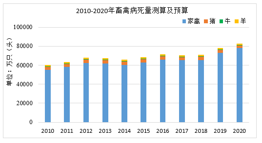 根據(jù)國家統(tǒng)計局、農(nóng)業(yè)農(nóng)村部公開畜禽出欄量/存欄量數(shù)據(jù)測算病死量。養(yǎng)殖場的畜禽死亡率一般在5%~10%之間,若按5%計算,我國畜禽死亡量從2010年6.03億頭(只)增長至2020年的8.25億頭(只),復(fù)合增長率3%,其中家禽類占據(jù)大部分。由于2018年“非洲豬瘟”疫情我國累積撲殺近100萬頭生豬,實際死亡量可能高于預(yù)測數(shù)值。死畜禽攜帶大量的病原微生物,不僅污染環(huán)境,對于人體健康和畜禽養(yǎng)殖業(yè)的健康發(fā)展也存在嚴(yán)重威脅。因此,對死畜禽進(jìn)行無害化處理是解決環(huán)境污染、實現(xiàn)畜牧業(yè)良性發(fā)展的必由之路。