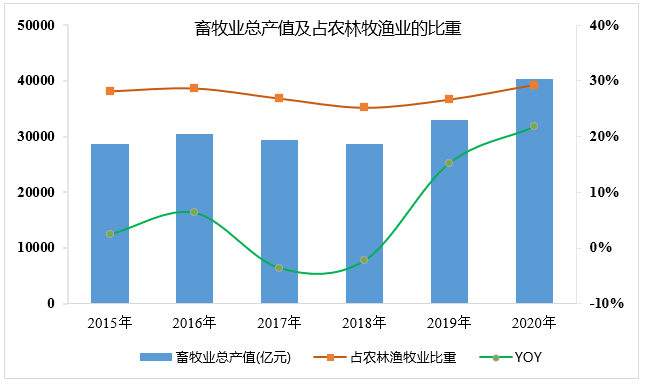 隨著生活水平的提高,人民對畜禽產(chǎn)品的需求不斷提升,進(jìn)而促進(jìn)了畜牧業(yè)的發(fā)展。根據(jù)國家統(tǒng)計局?jǐn)?shù)據(jù)顯示,全國畜牧業(yè)總產(chǎn)值從2015年28649億元發(fā)展到2020年的40266億元,經(jīng)過一定時期的增長,2020年畜牧業(yè)迎來歷史新高。畜牧業(yè)占農(nóng)林牧漁業(yè)總產(chǎn)值比重維持在25%~30%,已經(jīng)成為其支柱產(chǎn)業(yè)。畜牧業(yè)的快速發(fā)展對農(nóng)民的增收、農(nóng)村經(jīng)濟(jì)的發(fā)展做出了重大貢獻(xiàn)。