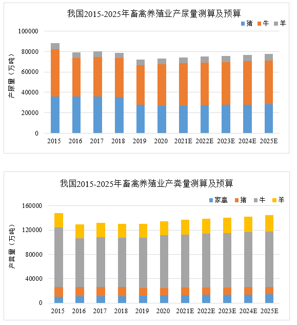 2019年,我國生豬市場受到“豬瘟”疫情影響,出欄量大幅下降。2020年受到新冠疫情全球化及進(jìn)出口貿(mào)易局勢影響,豬牛羊肉等市場預(yù)期有所恢復(fù)但增速不敵疫情前預(yù)期,畜牧行業(yè)整體受到一定影響,低谷期有所延長,預(yù)計三年內(nèi)市場將恢復(fù)平穩(wěn)。根據(jù)公開數(shù)據(jù)推算,我國畜禽養(yǎng)殖業(yè)主要類別禽畜產(chǎn)糞量將在10億噸左右,產(chǎn)尿量逾7億噸。