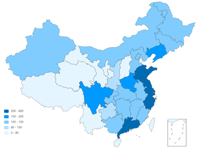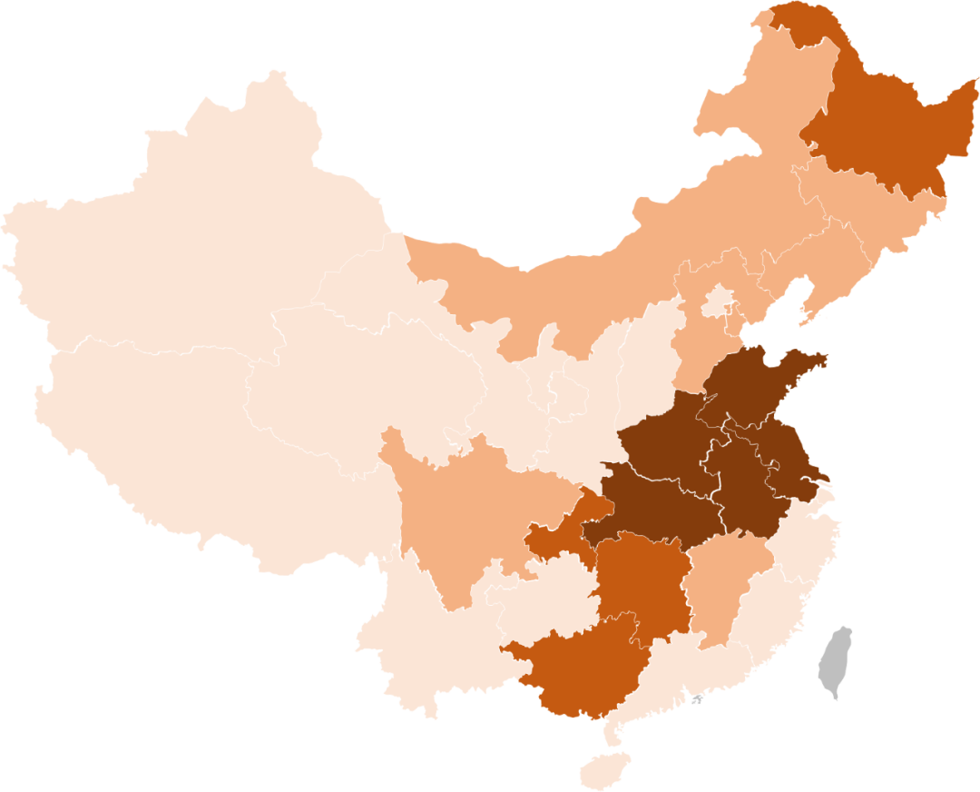 注:1、顏色越深代表該省秸稈資源化(此圖僅指能源化)可獲得水平越高,集約化開發(fā)價值越高。