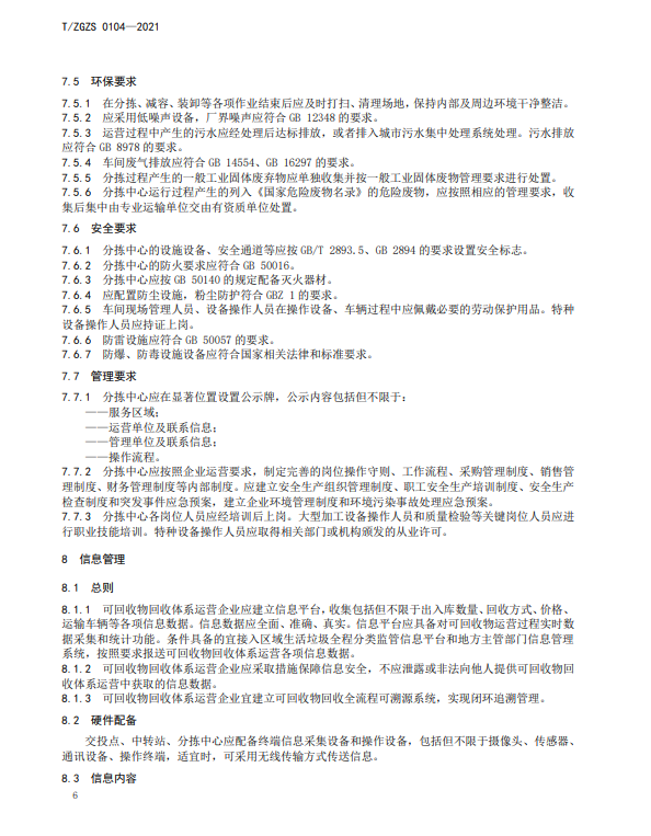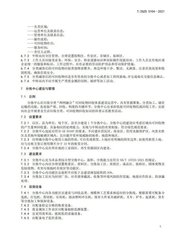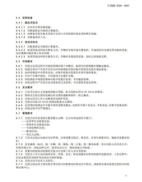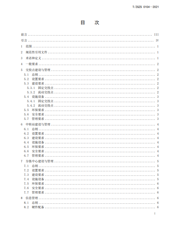 本標(biāo)準(zhǔn)立足于生活垃圾分類和廢舊物資循環(huán)利用體系構(gòu)建要求,結(jié)合再生資源回收行業(yè)運(yùn)行特點和當(dāng)前可回收物體系構(gòu)建的實踐,提出了可回收物體系中交投點、中轉(zhuǎn)站、分揀中心以及信息管理體系建設(shè)的相關(guān)要求,以更好提升可回收物回收體系運(yùn)行效率,促進(jìn)垃圾減量和資源有效利用。本標(biāo)準(zhǔn)主要包含以下內(nèi)容:目次、前言、引言、范圍、規(guī)范性引用文件、術(shù)語和定義、一般要求、交投點建設(shè)與管理、中轉(zhuǎn)站建設(shè)與管理、分揀中心建設(shè)與管理、信息管理、運(yùn)輸、標(biāo)識。