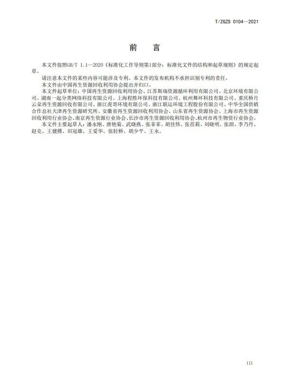 本標(biāo)準(zhǔn)起草單位包括中國再生資源回收利用協(xié)會、江蘇斯瑞資源循環(huán)利用有限公司、北京環(huán)境有限公司、湖南一起分類網(wǎng)絡(luò)科技有限公司、上海程勝環(huán)??萍加邢薰?、杭州舞環(huán)科技有限公司、重慶橋月云朵再生資源回收有限公司、浙江虎哥環(huán)境有限公司、浙江聯(lián)運(yùn)環(huán)境工程股份有限公司、中華全國供銷合作總社天津再生資源研究所、安徽省再生資源回收利用協(xié)會、山東省再生資源協(xié)會、上海市再生資源回收利用行業(yè)協(xié)會、南京再生資源行業(yè)協(xié)會、長沙市再生資源回收利用協(xié)會、杭州市再生物資行業(yè)協(xié)會。