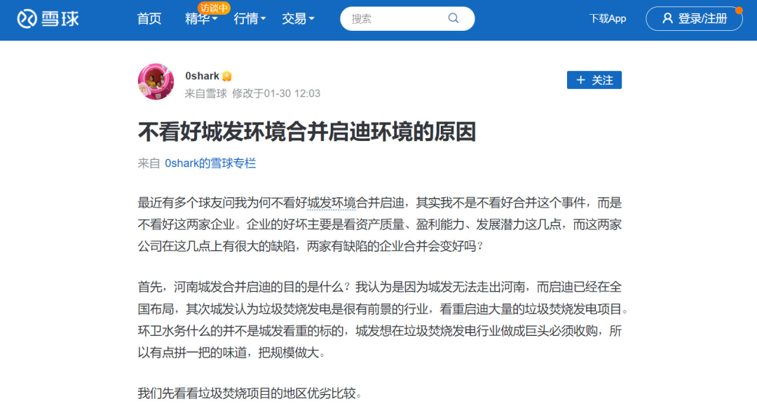 記得今年1月城發(fā)環(huán)境吸并啟迪環(huán)境的消息剛傳出,“雪球”上就有一個帖子,闡述了“不看好城發(fā)環(huán)境合并啟迪環(huán)境的原因”。