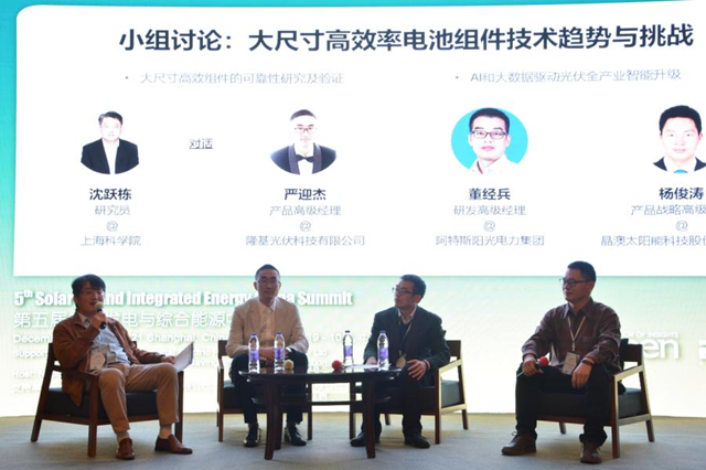 下午的小組討論主題為:大尺寸高效率電池組件技術(shù)趨勢(shì)與挑戰(zhàn),該討論由上海科學(xué)院研究員沈躍棟主持,隆基光伏科技有限公司產(chǎn)品高級(jí)經(jīng)理嚴(yán)迎杰、阿特斯陽(yáng)光電力集團(tuán)研發(fā)高級(jí)經(jīng)理董經(jīng)兵、晶澳太陽(yáng)能科技股份有限公司產(chǎn)品戰(zhàn)略高級(jí)經(jīng)理?xiàng)羁e極參與了討論。嘉賓們圍繞大尺寸高效組件的可靠性研究及驗(yàn)證、AI和大數(shù)據(jù)驅(qū)動(dòng)光伏全產(chǎn)業(yè)智能升級(jí)等話題展開了交流和探討。臺(tái)上臺(tái)下積極互動(dòng),將第一天的會(huì)議推向了高潮。