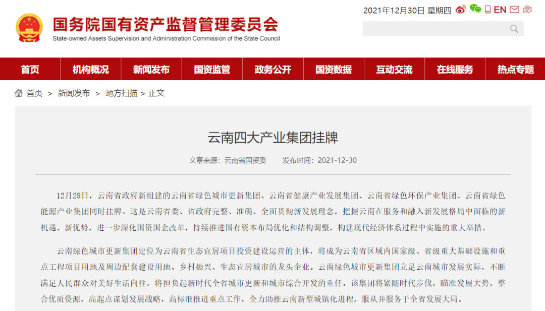 12月28日,云南省一口氣就組建了4家省級國資集團。