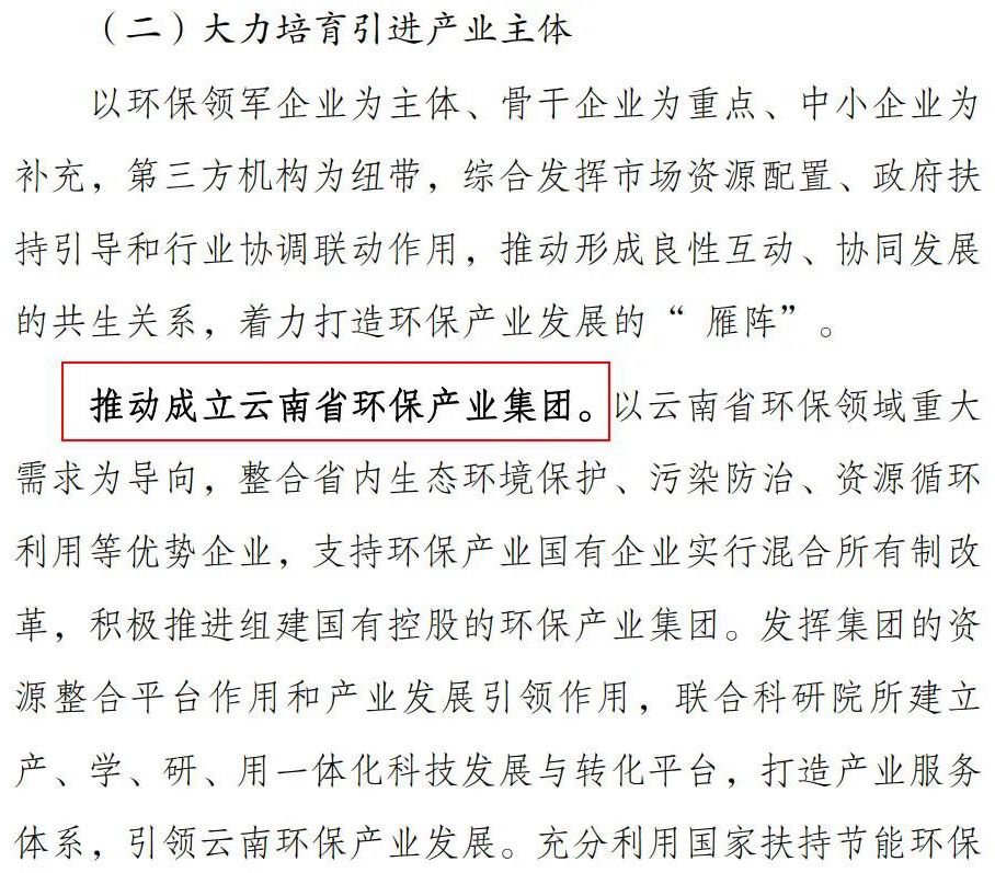 當時,云南省發(fā)布《云南省“十四五”環(huán)保產業(yè)發(fā)展規(guī)劃(征求意見稿)》,其中提到,要推動成立云南省環(huán)保產業(yè)集團。以云南省環(huán)保領域重大需求為導向,整合省內生態(tài)環(huán)境保護、污染防治、資源循環(huán)利用等優(yōu)勢企業(yè),支持環(huán)保產業(yè)國有企業(yè)實行混合所有制改革,積極推進組建國有控股的環(huán)保產業(yè)集團。
