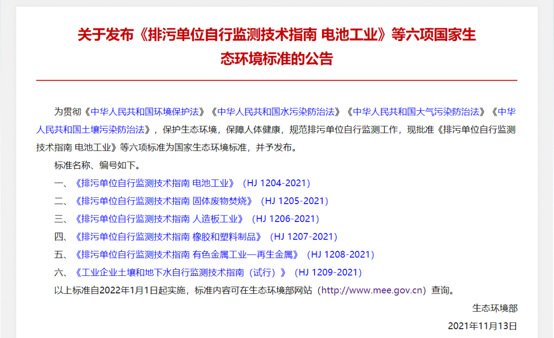 《排污單位自行監(jiān)測(cè)技術(shù)指南 電池工業(yè)》等六項(xiàng)國(guó)家生態(tài)環(huán)境標(biāo)準(zhǔn)