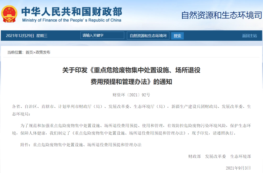 重點(diǎn)危險(xiǎn)廢物集中處置設(shè)施、場(chǎng)所退役費(fèi)用預(yù)提和管理辦法