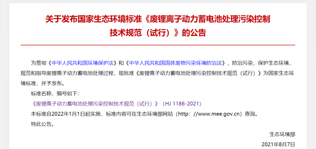 廢鋰離子動(dòng)力蓄電池處理污染控制技術(shù)規(guī)范(試行)