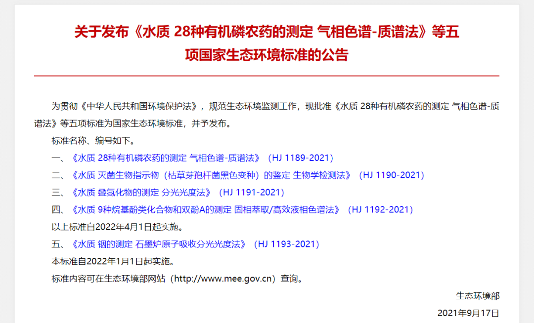 《水質(zhì) 28種有機(jī)磷農(nóng)藥的測(cè)定 氣相色譜-質(zhì)譜法》等五項(xiàng)國(guó)家生態(tài)環(huán)境標(biāo)準(zhǔn)