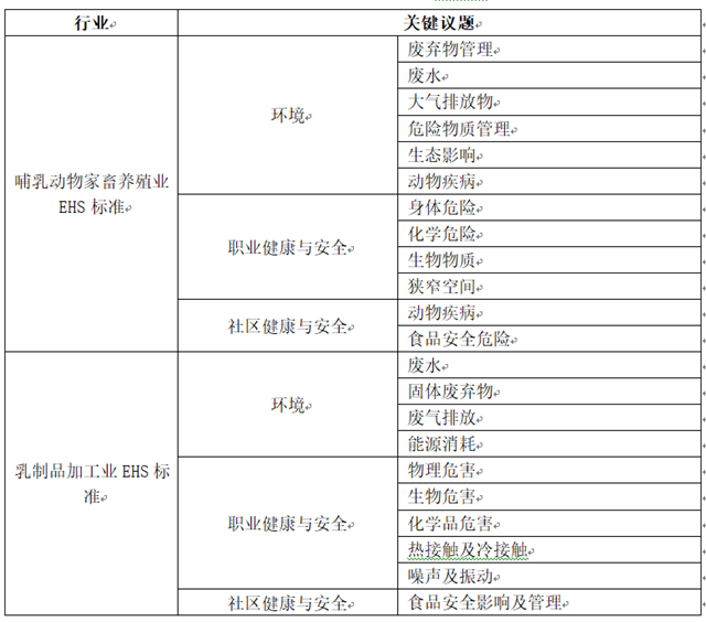 在聯(lián)合國可持續(xù)發(fā)展目標及各個國際組織出臺的可持續(xù)議題基礎之上,目前國際上也形成了行業(yè)導向的可持續(xù)發(fā)展標準。其中,由世界銀行集團國際金融公司制定的《環(huán)境、健康與安全指南(EHS)》中就有針對乳制品行業(yè)的養(yǎng)殖端與加工端,在充分考慮行業(yè)特色的基礎上分別形成了兩套指標,《哺乳動物家畜養(yǎng)殖業(yè)環(huán)境、健康與安全指南》與《乳制品加工業(yè)環(huán)境、健康與安全指南》,重點關(guān)注行業(yè)在環(huán)境、職業(yè)健康與安全、社區(qū)健康與安全三大領(lǐng)域下的可持續(xù)發(fā)展。對于乳制品行業(yè)的養(yǎng)殖端來說,應重點關(guān)注環(huán)境層面的表現(xiàn),包括養(yǎng)殖過程中的廢棄物、廢水處理、溫室氣體排放情況、潛在生態(tài)影響、動物疾病等方面;對于加工端來說,應重點關(guān)注加工制造過程中的能耗情況、廢氣排放情況、固體廢棄物處理,以及生產(chǎn)安全情況等方面。