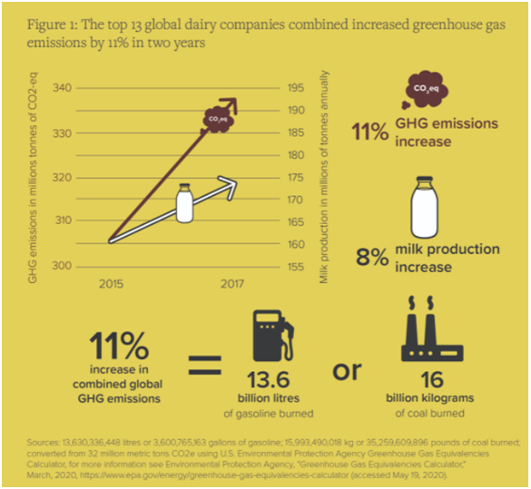 乳制品指的是使用牛乳或羊乳及其加工制品為主要原料,加入或不加入適量的維生素、礦物質(zhì)和其他輔料,使用法律法規(guī)及標準規(guī)定所要求的條件,經(jīng)加工制成的各種食品。乳制品包括液體乳(巴氏殺菌乳、滅菌乳、調(diào)制乳、發(fā)酵乳);乳粉(全脂乳粉、脫脂乳粉、部分脫脂乳粉、調(diào)制乳粉、牛初乳粉);其他乳制品(等)。國際農(nóng)業(yè)和貿(mào)易政策研究所(IATP)2020年發(fā)布的《Milking the Planet》報告指出,乳制品行業(yè)是全球溫室氣體排放量上升的主要原因之一。報告中提到2017年全球十三大乳制品公司產(chǎn)生了超過3.38億噸的溫室氣體,已經(jīng)超過了兩個全球最大的化石燃料排放企業(yè)總部位于澳大利亞的礦業(yè)、石油和天然氣巨頭(BHP)和總部位于美國的石油公司(ConocoPhillips)。盡管各國政府在2015年簽署了《巴黎協(xié)定》,致力于控制碳排放量,但2015-2017年這13家公司的總排放量仍增長了11%,增加的3230萬噸溫室氣體相當于一年內(nèi)行駛690萬輛乘用車造成的污染。