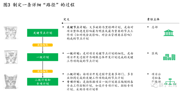 這些應(yīng)當(dāng)做的事項(xiàng)應(yīng)該明確下來,成為詳細(xì)的項(xiàng)目實(shí)施計(jì)劃——在時(shí)間維度上確定每個(gè)時(shí)間節(jié)點(diǎn)上,明確每個(gè)參與者要提供什么、做到什么,這才真正把目標(biāo)分解下去。大多成功案例中,企業(yè)的工程管理都是抓大放小,先管住關(guān)鍵節(jié)點(diǎn),把控整個(gè)項(xiàng)目,在關(guān)鍵節(jié)點(diǎn)下,再一步步確定更加詳細(xì)的計(jì)劃(如圖3)。如果每個(gè)階段的目標(biāo)都能達(dá)成,那么最終的目標(biāo)自然能夠?qū)崿F(xiàn)。