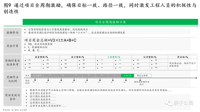 因此,工程管理的價(jià)值并非不可衡量,但是要有一定的前提——要有一個(gè)沒有水分的預(yù)算,和一個(gè)沒有偷工減料的結(jié)算。在以往服務(wù)的案例中,辰于將工程管理的激勵(lì)與整個(gè)項(xiàng)目全生命周期結(jié)合在一起,以整個(gè)項(xiàng)目的利潤最大化為目標(biāo),設(shè)定各個(gè)階段的反向約束條件,使工程管理的價(jià)值量化評(píng)估,更重要的是,實(shí)現(xiàn)了項(xiàng)目全生命周期收益的最大化(見圖9)。