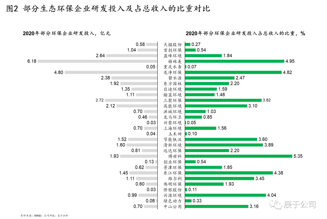 造成以上問(wèn)題的原因很多,主要有兩個(gè):一是國(guó)內(nèi)生態(tài)環(huán)保行業(yè)之前一直處于簡(jiǎn)單、粗暴的“跑馬圈地”時(shí)代,強(qiáng)政府關(guān)系和低成本融資成為這一階段企業(yè)制勝的“不二法寶”,這種“浮躁”的大環(huán)境導(dǎo)致很多企業(yè)“重投建、輕技運(yùn)”;二是創(chuàng)新型和革新型技術(shù)投入周期長(zhǎng),回報(bào)不明顯,很多企業(yè)尤其是三年任期制下的國(guó)企高層們?nèi)狈ψ銐蚰托模蒎e(cuò)機(jī)制缺失也讓他們對(duì)高風(fēng)險(xiǎn)的研發(fā)投入持謹(jǐn)慎態(tài)度,這從生態(tài)環(huán)保領(lǐng)域的上市企業(yè)的研發(fā)投入占收入的比重可見(jiàn)一斑(見(jiàn)圖2)。