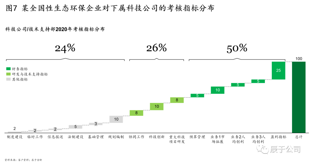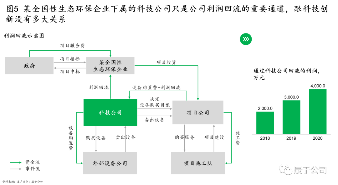 然而實(shí)際情況是:這些技術(shù)公司要么是“扶不起的阿斗”,經(jīng)營(yíng)多年,干的仍然主要是公司內(nèi)部的那些業(yè)務(wù),有些甚至“只外包不實(shí)干”,成為名副其實(shí)的“二道販子”,徒增成本之外,對(duì)企業(yè)沒(méi)有太多增值(見(jiàn)圖5);要么是“眼睛全往外看”,一心想的是如何開(kāi)拓外部市場(chǎng),對(duì)公司內(nèi)部的業(yè)務(wù)“不聞不問(wèn)不參與”,例如針對(duì)一家全國(guó)性生態(tài)環(huán)保企業(yè)的調(diào)研發(fā)現(xiàn),下屬技術(shù)公司超過(guò)80%的技術(shù)人員都在做外部市場(chǎng),只有不足20%的人偶爾會(huì)參與內(nèi)部項(xiàng)目,8條業(yè)務(wù)線只有1條業(yè)務(wù)線形成了標(biāo)準(zhǔn)化的技術(shù)方案。