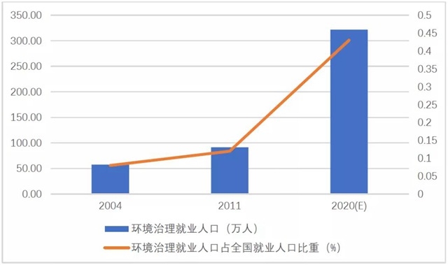 圖2 環(huán)境治理就業(yè)人口及占全國(guó)就業(yè)人口比重