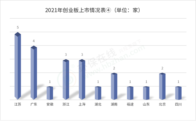 上述數(shù)據(jù)顯示,2021年,登陸創(chuàng)業(yè)板的環(huán)保企業(yè)以江蘇最多,廣東次之,浙江和上海均有三家,整體覆蓋11個(gè)省市。除了江浙、北上廣以及福建這些市場(chǎng)“寵兒”,“兩湖”加皖魯川也各有斬獲,總體來(lái)看南方市場(chǎng)比較受歡迎。