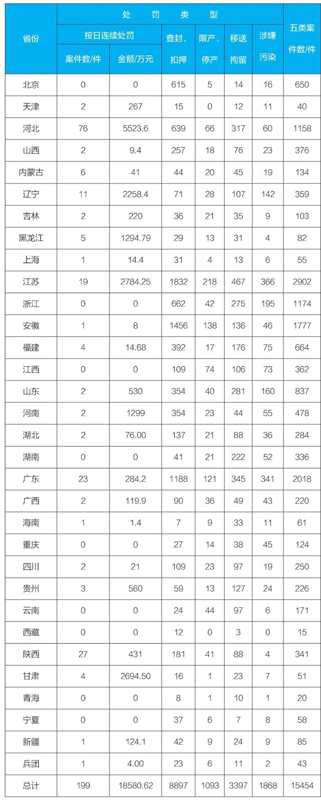 2021年1-12月,全國五類案件總數(shù)為15454件。其中,按日連續(xù)處罰案件數(shù)量為199件,罰款金額為18580.62萬元;適用查封、扣押案件數(shù)量為8897件;適用限產(chǎn)、停產(chǎn)案件數(shù)量為1093件;移送拘留案件數(shù)量為3397件;移送涉嫌環(huán)境污染犯罪案件數(shù)量為1868件。