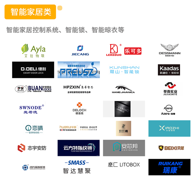 智能家居展區(qū)規(guī)劃在3-4號(hào)連接館集中展示,作為行業(yè)目前最熱門(mén)板塊,展品范圍涵蓋智能鎖、智能晾衣機(jī)、智能家居系統(tǒng)等,目前入駐部分品牌有:艾拉物聯(lián)(Ayla)、么匚(LITOBOX)、樂(lè)可多智能鎖、凱迪仕智能鎖、德利智能鎖、施若德智能鎖、德施曼智能鎖、步安鎖業(yè)、惠普智芯、舉嘉實(shí)業(yè)、戀晴、德洛克、雅尊、穿山甲智能鎖、鎖貿(mào)通展團(tuán)等共計(jì)86家智能行業(yè)企業(yè)已報(bào)名參展。