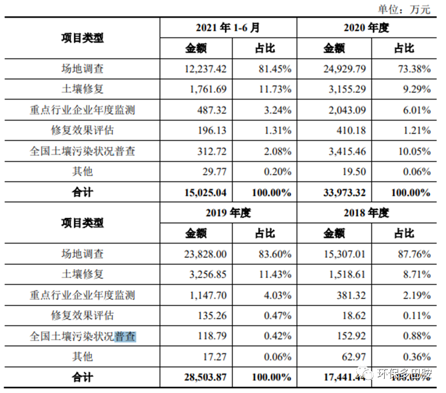 “報(bào)告期各期(2018-2021H1),公司土壤和地下水檢測業(yè)務(wù)收入分別為 17,441.44 萬元、28,503.87 萬元、33,973.32 萬元、15,025.04 萬元,占公司主營業(yè)務(wù)收入的比重分 別為 98.15%、95.69%、94.73%、91.81%。”