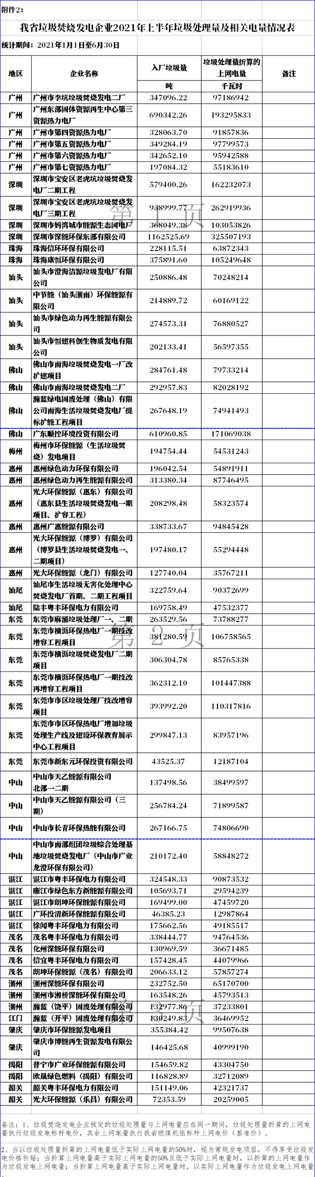 根據(jù)原省物價局《轉發(fā)國家發(fā)展改革委關于完善垃圾焚燒發(fā)電價格政策的通知》(粵價〔2012〕170號)及我委《關于進一步做好垃圾焚燒發(fā)電項目垃圾處理量核定工作的通知》(粵發(fā)改價格函〔2020〕1915號)等文件規(guī)定,經(jīng)審核,現(xiàn)公布我省有關垃圾焚燒發(fā)電企業(yè)2020年下半年和2021年上半年的垃圾處理量及折算的上網(wǎng)電量,詳見附件。
