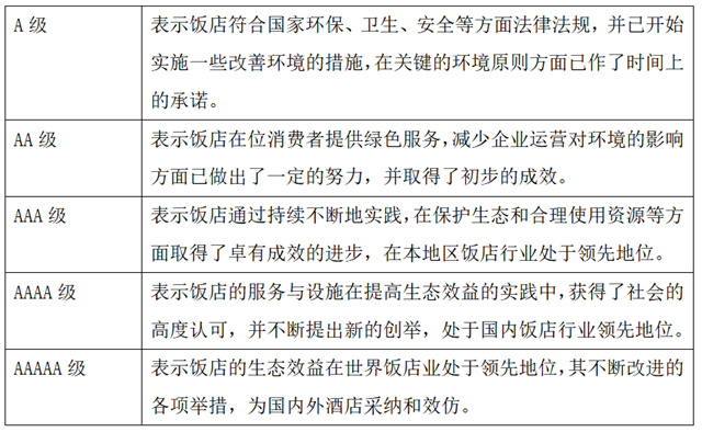 我國于2007年發(fā)布了《綠色飯店等級評定規(guī)定》,根據(jù)企業(yè)在提供綠色服務、保護環(huán)境等方面做出的努力將綠色酒店分為五個等級,具體內容如下。