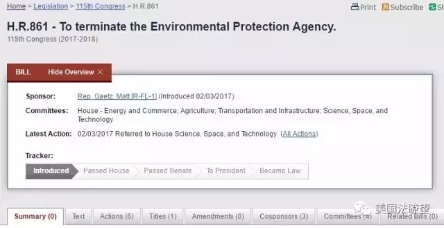2017-02-14 中國環(huán)境新聞2017年2月3日,美國國會(huì)公布了一份來自國會(huì)參議員的提案,名稱為《撤銷環(huán)境保護(hù)局》(To terminate the Environmental Protection Agency),提議在2018年底撤銷國家環(huán)境保護(hù)局。What ? 在環(huán)境議題已經(jīng)在全世界廣受關(guān)注的時(shí)候,居然會(huì)有人提議撤銷環(huán)保局!美國國會(huì)網(wǎng)站公布的“關(guān)于撤銷環(huán)境保護(hù)局議案”這份“撤銷環(huán)境保護(hù)局”的議案由來自佛羅里達(dá)州第一選區(qū)的參議員馬特?蓋茨(Matt Gaetz)牽頭提出,該議案同時(shí)有另外三名共和黨議員聯(lián)名附屬簽名提出。