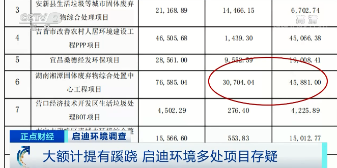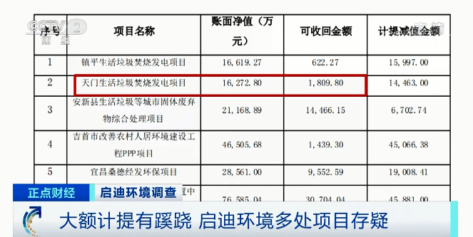 多位知情人士均表示,前幾年聽說過這里要建垃圾焚燒站,只是一開始有人來看過地址,平整場(chǎng)地,但由于附近居民反對(duì),相關(guān)工程根本沒有開始建,更不存在賬面金額達(dá)到上億元的可能。湖北省天門市白茅湖農(nóng)場(chǎng)附近村民:那是垃圾發(fā)電廠,就是前幾年的事,劃了位置,最后沒搞起來。湖北省天門市白茅湖農(nóng)場(chǎng)附近村民:是我們親自弄的,不讓他們拖東西進(jìn)來。沒有建造,只是當(dāng)時(shí)搞過提議。估計(jì)這邊賠了一百多萬元,那邊賠了兩百多萬元。加起來四百多萬元,不到五百萬元。 除了天門項(xiàng)目之外,啟迪環(huán)境還同時(shí)對(duì)另外11個(gè)項(xiàng)目都進(jìn)行了計(jì)提,記者注意到,這些項(xiàng)目中賬面凈值規(guī)模最大,計(jì)提減值金額最高的項(xiàng)目位于湖南湘潭,目前已經(jīng)計(jì)提了4.5億元的資產(chǎn)減值損失,可回收金額依然超過3億元。