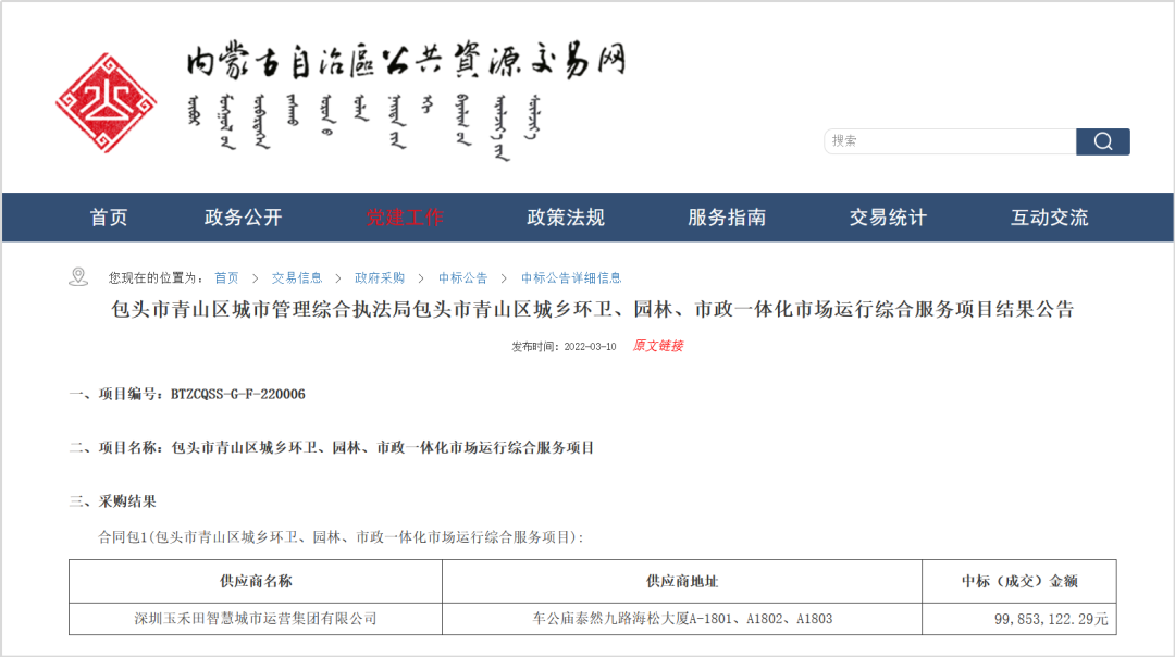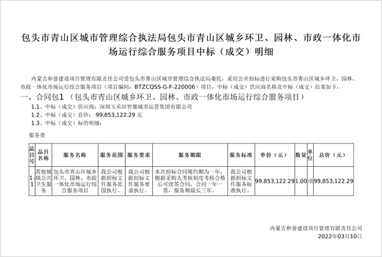 內(nèi)蒙古自治區(qū)政府采購(gòu)網(wǎng)、內(nèi)蒙古自治區(qū)公共資源交易網(wǎng)消息,2022年3月10日,包頭市青山區(qū)城鄉(xiāng)環(huán)衛(wèi)、園林、市政一體化市場(chǎng)運(yùn)行綜合服務(wù)項(xiàng)目開標(biāo)。