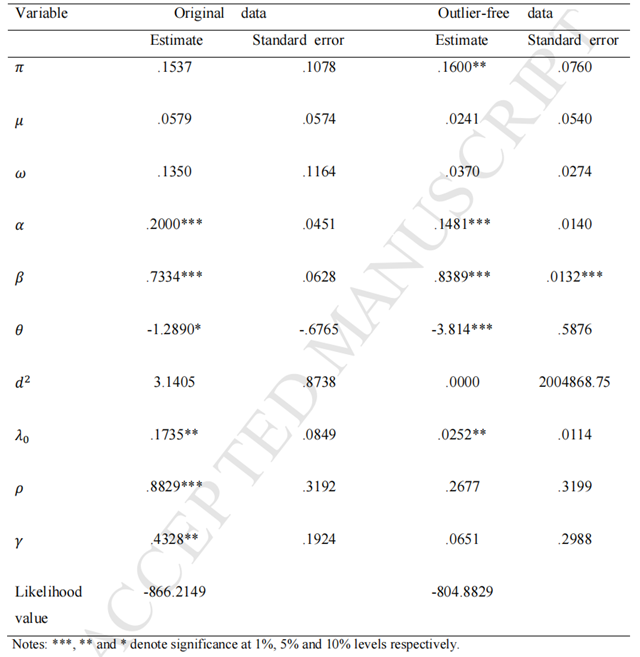 運用AR(1)-GARCH(1,1)模型對EUA回報的時間序列進(jìn)行擬合,用擬極大似然估計法估計系數(shù),將超出正常波動范圍的回報率視為離群數(shù)據(jù),公式如圖1。AR(1)-GARCH(1,1)模型的優(yōu)點是即使對誤差項的分布形式選擇有誤,或者模型選擇有誤,仍能準(zhǔn)確找出離群值。