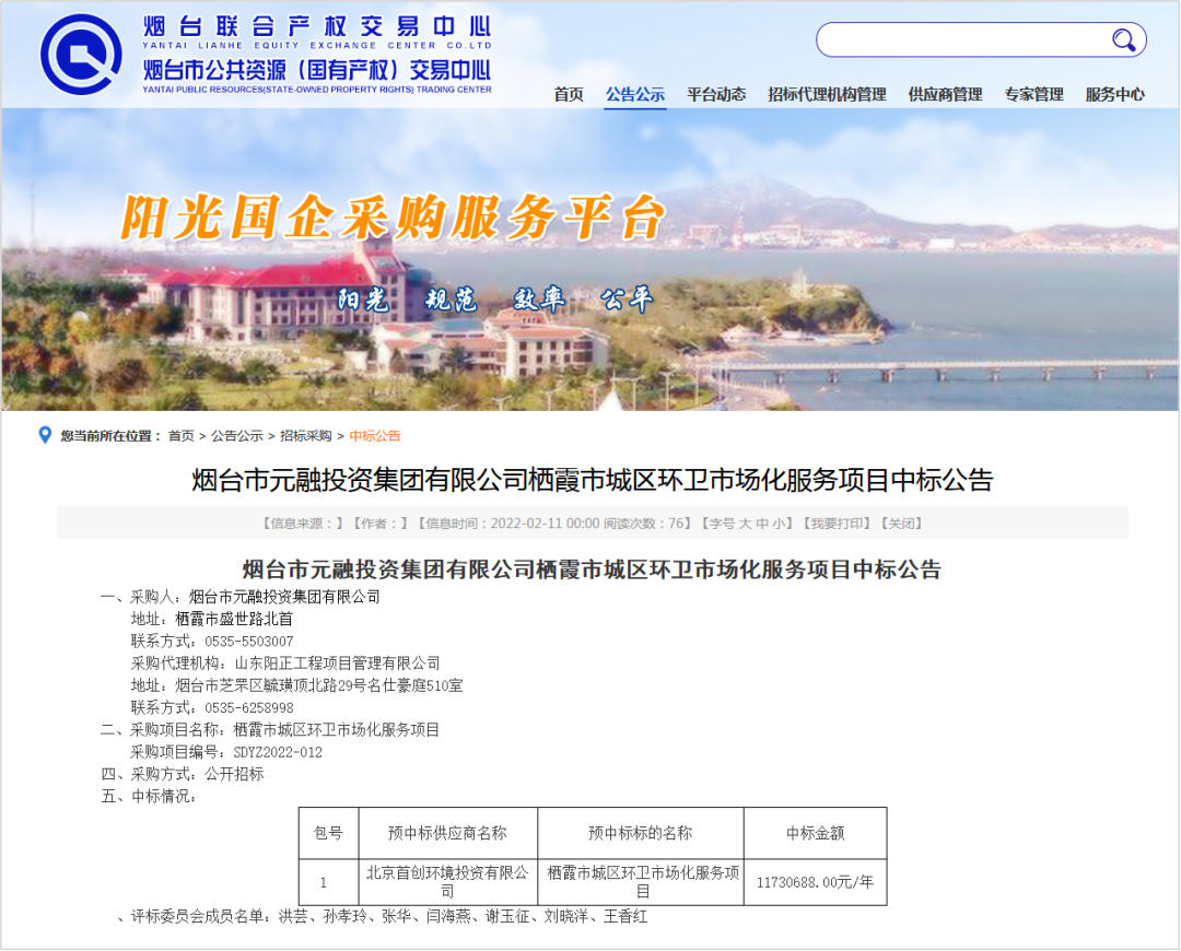 煙臺市公共資源(國有產權)交易中心消息,2022年2月11日,煙臺市元融投資集團有限公司棲霞市城區(qū)環(huán)衛(wèi)市場化服務項目開標,中標結果如下: