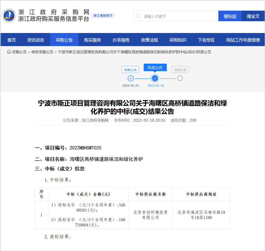 3月18日,浙江政府采購網(wǎng)發(fā)布寧波市海曙區(qū)高橋鎮(zhèn)道路保潔和綠化養(yǎng)護項目中標公告,北京首創(chuàng)環(huán)境投資有限公司以10072.9804萬元/3年的投標價格中標該項目。 近日,首創(chuàng)環(huán)境在環(huán)衛(wèi)市場連下兩城,中標金額約1.6億元。